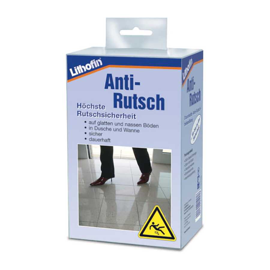 • Lithofin Anti-Rutsch temel temizleyici ve kaydırmazlık sıvısından oluşan bir kaydırmazlık setidir. Yüzeyi kaygan seramik, granit-seramik, doğal taş vb. kaplamaların ıslak halde iken kaydırmaz bir özelliğe sahip olmasını sağlar. Yüzey kuru haldeyken hiç bir değişiklik farkedilmez.